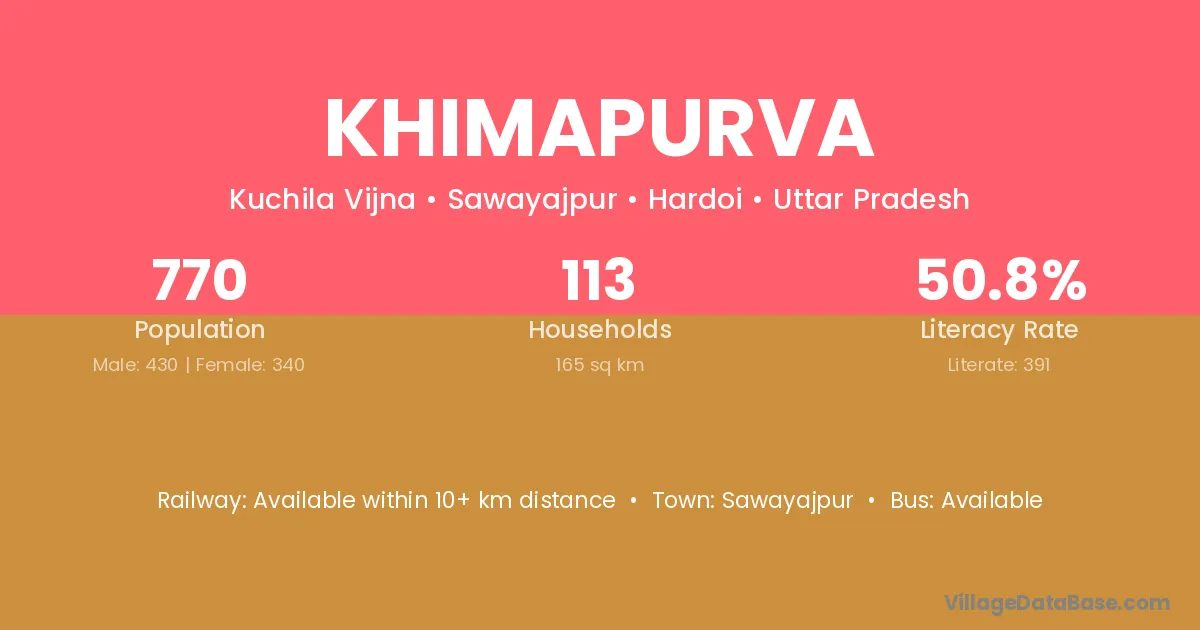 Khimapurva village has a total population of 770 people, of which 430 are males and 340 are females.