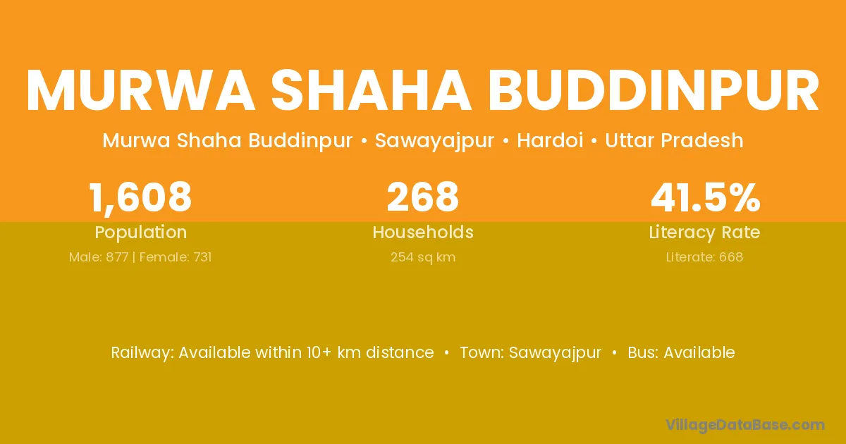 Murwa Shaha Buddinpur village has a total population of 1,608 people, of which 877 are males and 731 are females.