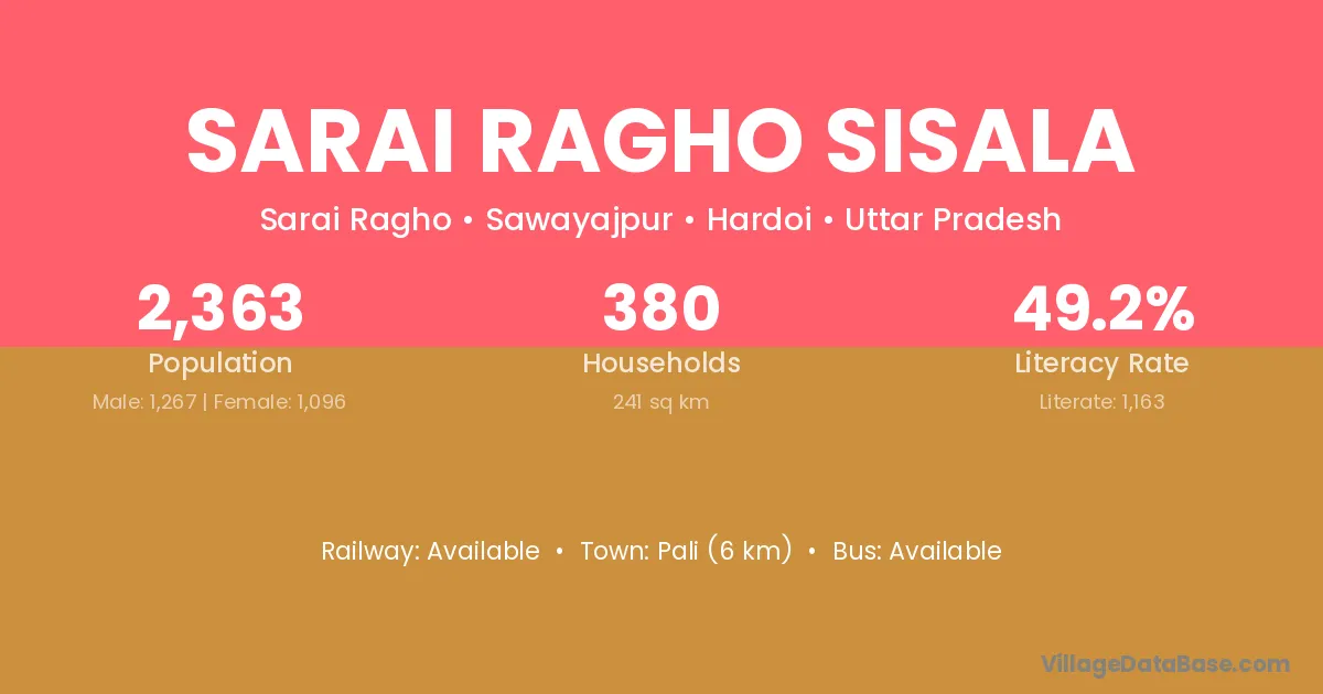 Sarai Ragho Sisala village has a total population of 2,363 people, of which 1,267 are males and 1,096 are females.