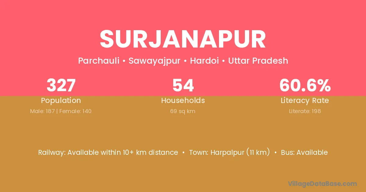 Harpalpur (11 km) is the nearest town to Surjanapur village for major economic activities and is located approximately 11 km away.