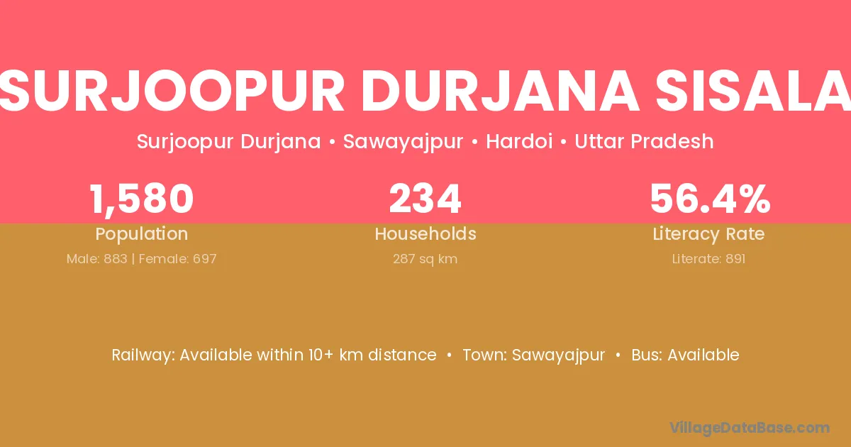 Surjoopur Durjana Sisala village has a total population of 1,580 people, of which 883 are males and 697 are females.