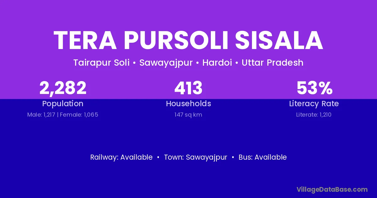 Tera Pursoli Sisala village has a total population of 2,282 people, of which 1,217 are males and 1,065 are females.