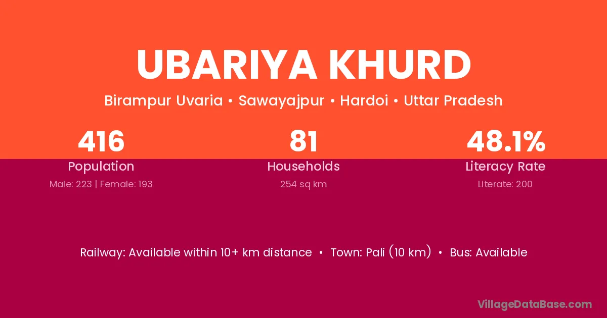 Ubariya Khurd village has a total population of 416 people, of which 223 are males and 193 are females.