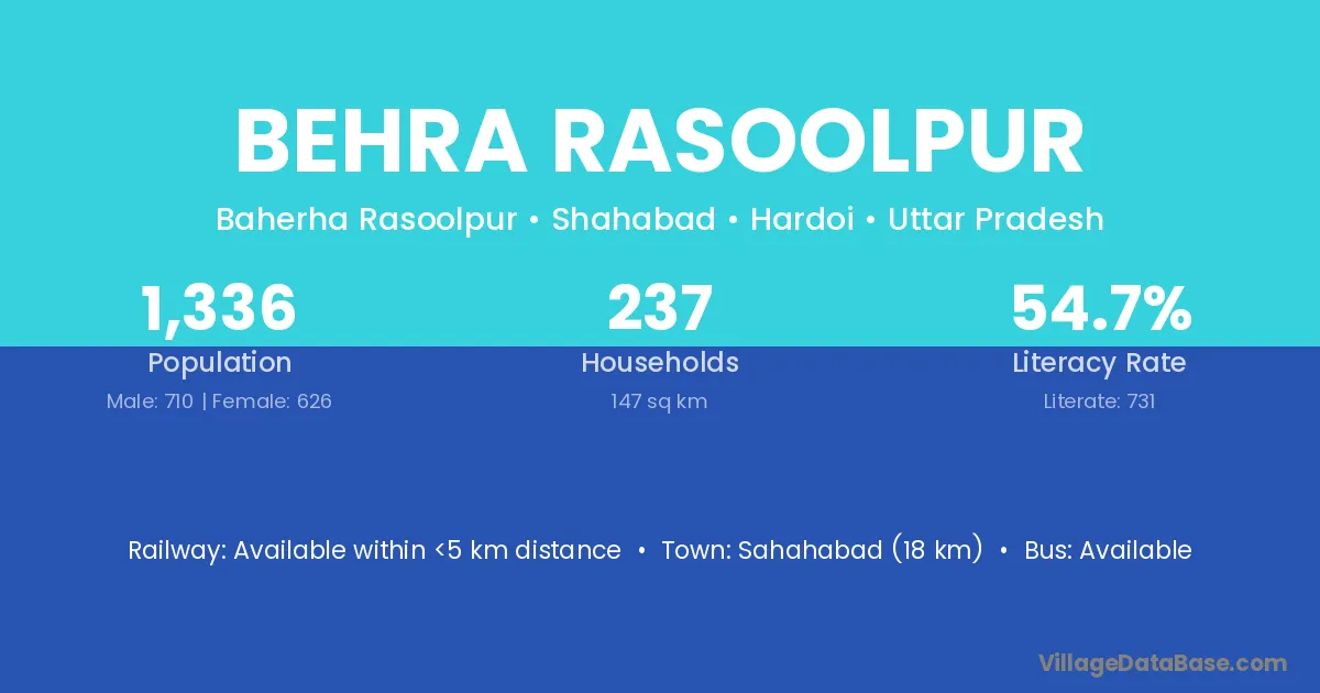 Behra Rasoolpur village has a total population of 1,336 people, of which 710 are males and 626 are females.