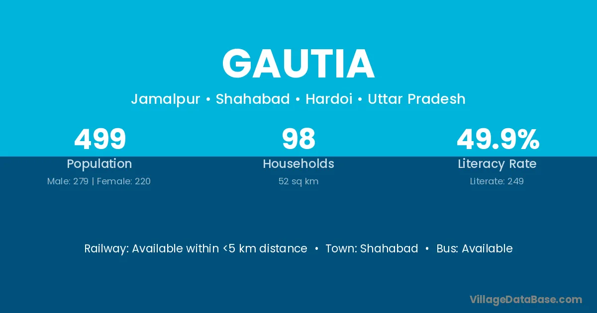 Gautia village has a total population of 499 people, of which 279 are males and 220 are females.