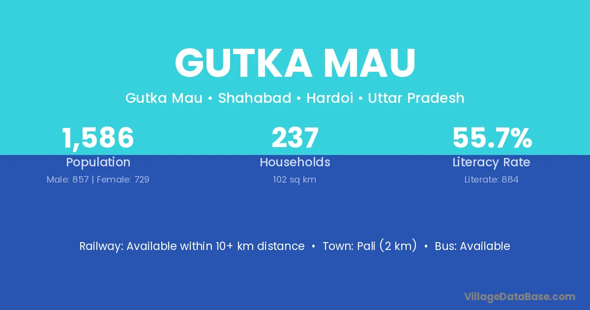 Pali (2 km) is the nearest town to Gutka Mau village for major economic activities and is located approximately 2 km away.