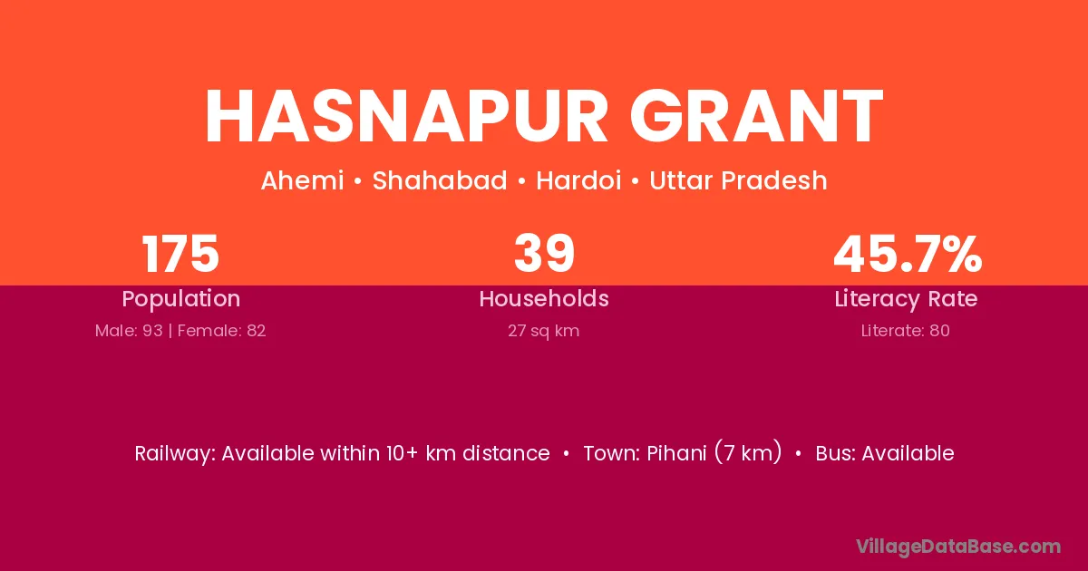 Pihani (7 km) is the nearest town to Hasnapur Grant village for major economic activities and is located approximately 7 km away.