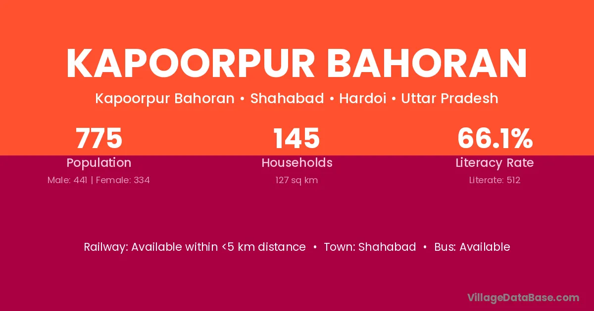 Kapoorpur Bahoran village has a total population of 775 people, of which 441 are males and 334 are females.