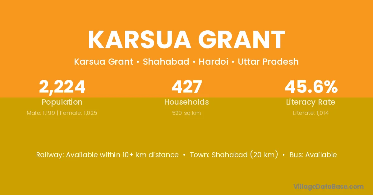 Shahabad (20 km) is the nearest town to Karsua Grant village for major economic activities and is located approximately 20 km away.