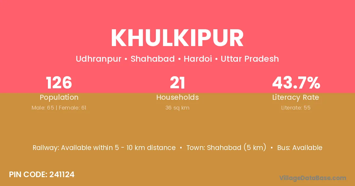 Shahabad (5 km) is the nearest town to Khulkipur village for major economic activities and is located approximately 5 km away.