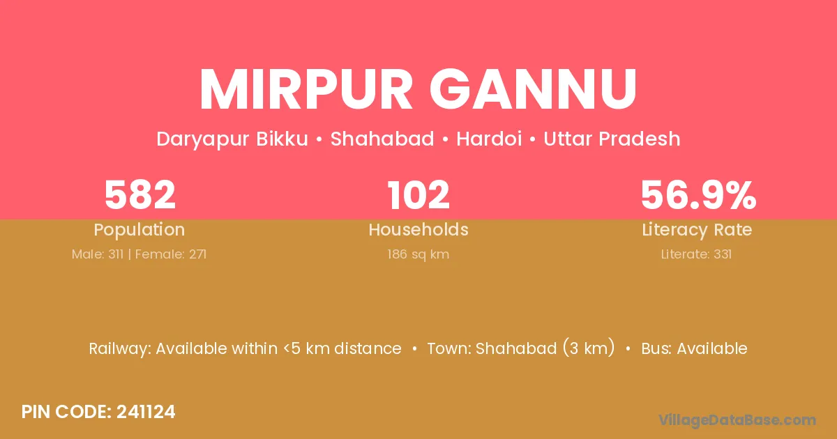 Mirpur Gannu village has a total population of 582 people, of which 311 are males and 271 are females.