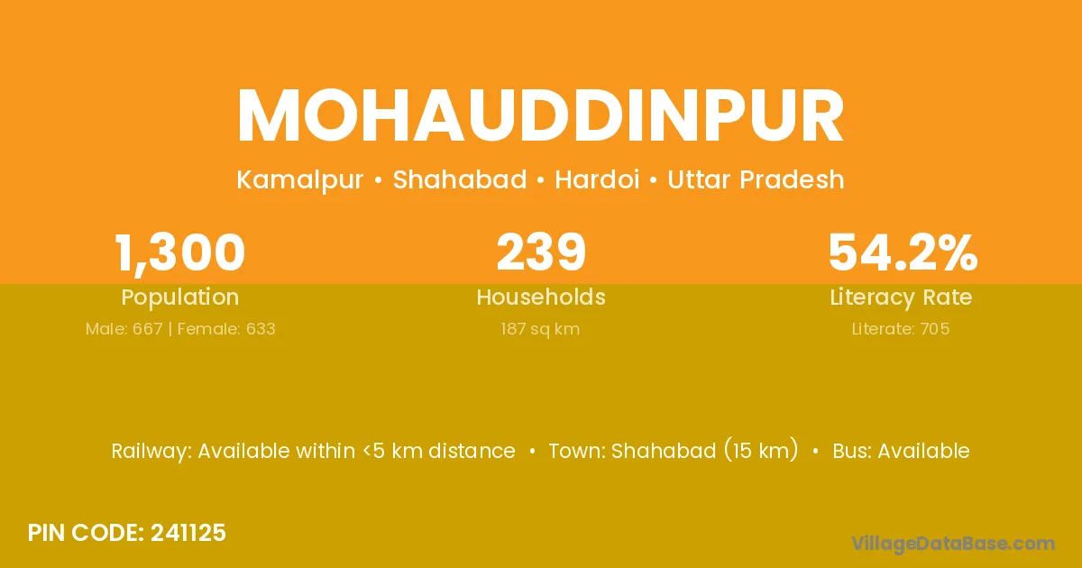 Shahabad (15 km) is the nearest town to Mohauddinpur village for major economic activities and is located approximately 15 km away.