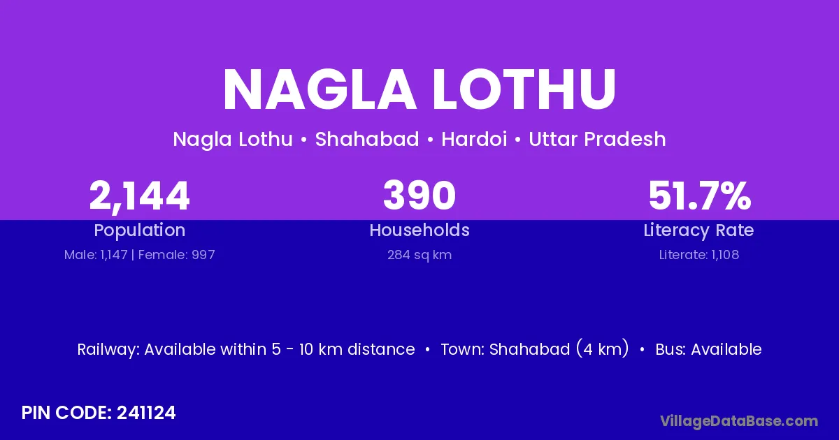 Nagla Lothu village has a total population of 2,144 people, of which 1,147 are males and 997 are females.