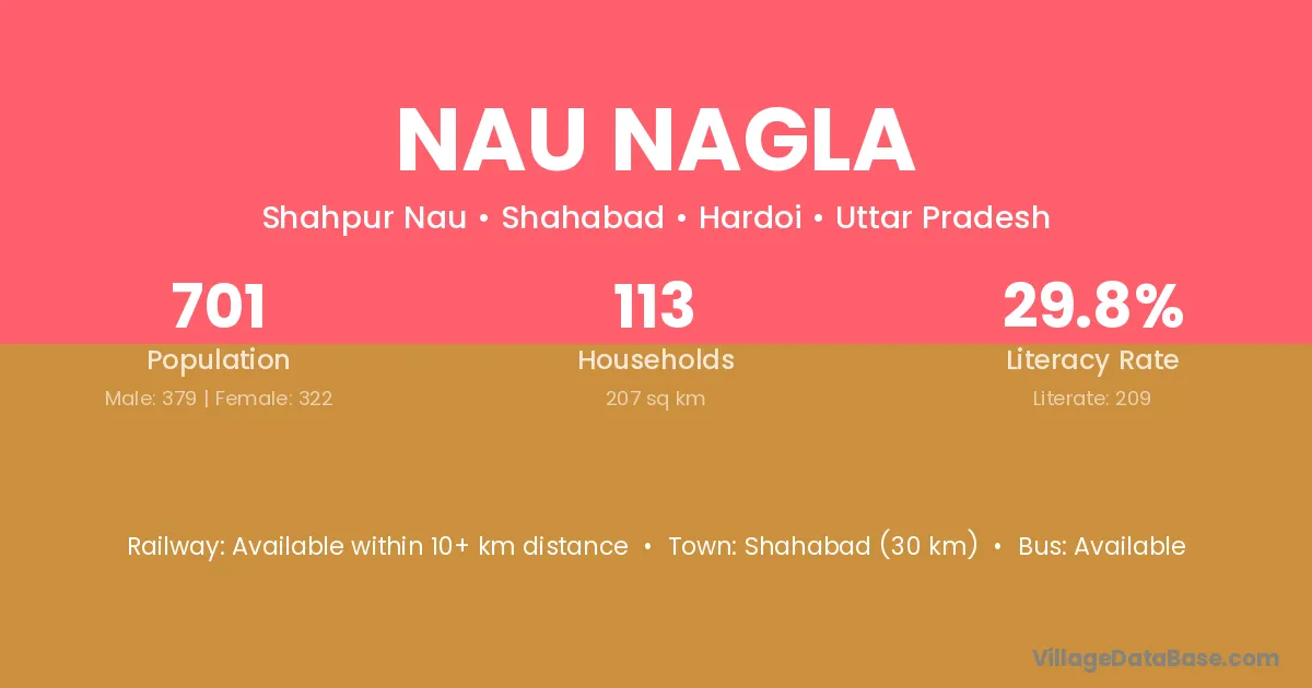 Shahabad (30 km) is the nearest town to Nau Nagla village for major economic activities and is located approximately 30 km away.