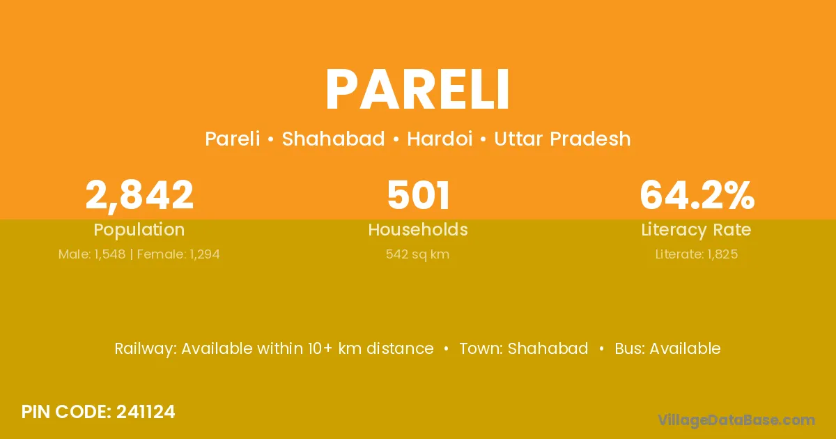 Pareli village has a total population of 2,842 people, of which 1,548 are males and 1,294 are females.