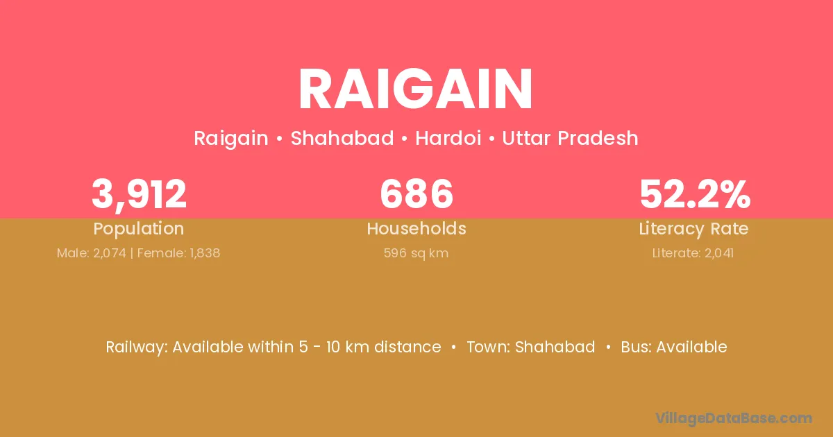 Raigain village has a total population of 3,912 people, of which 2,074 are males and 1,838 are females.
