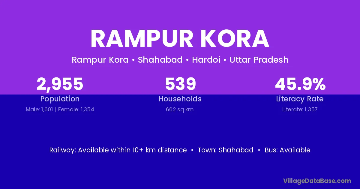 Rampur Kora village has a total population of 2,955 people, of which 1,601 are males and 1,354 are females.