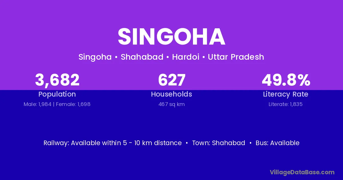 Singoha village has a total population of 3,682 people, of which 1,984 are males and 1,698 are females.