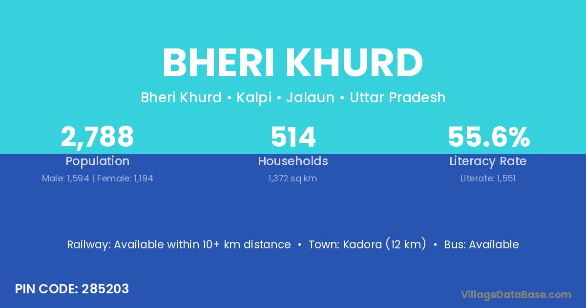 Kadora (12 km) is the nearest town to Bheri Khurd village for major economic activities and is located approximately 12 km away.