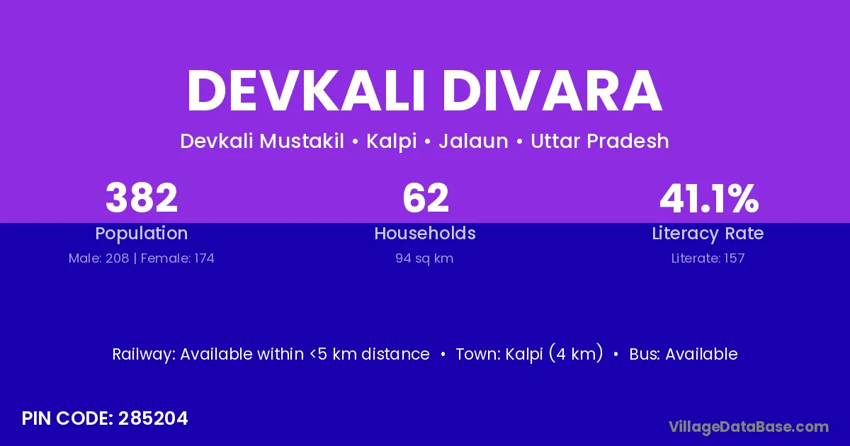Kalpi (4 km) is the nearest town to Devkali Divara village for major economic activities and is located approximately 4 km away.