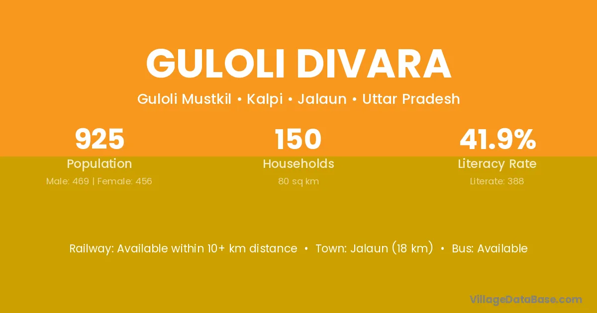 Jalaun (18 km) is the nearest town to Guloli Divara village for major economic activities and is located approximately 18 km away.