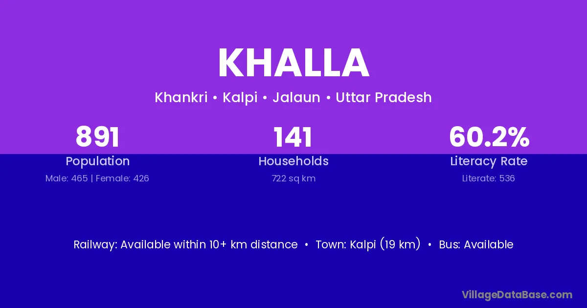 Kalpi (19 km) is the nearest town to Khalla village for major economic activities and is located approximately 19 km away.
