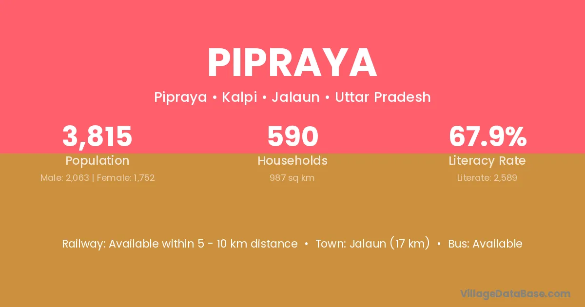 Jalaun (17 km) is the nearest town to Pipraya village for major economic activities and is located approximately 17 km away.