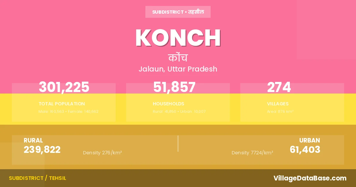 According to the 2011 census The total area of Konch Tehsil is 876 km², with a population of 301225 people. The population density is 344 inhabitants per square kilometre, and there are approximately 51857 houses in the sub district.