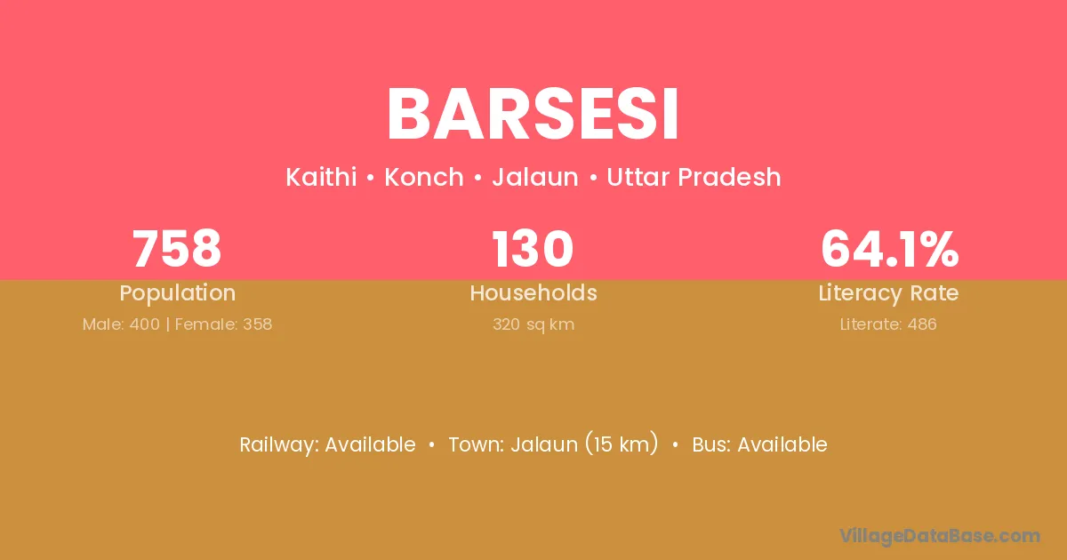 Jalaun (15 km) is the nearest town to Barsesi village for major economic activities and is located approximately 15 km away.