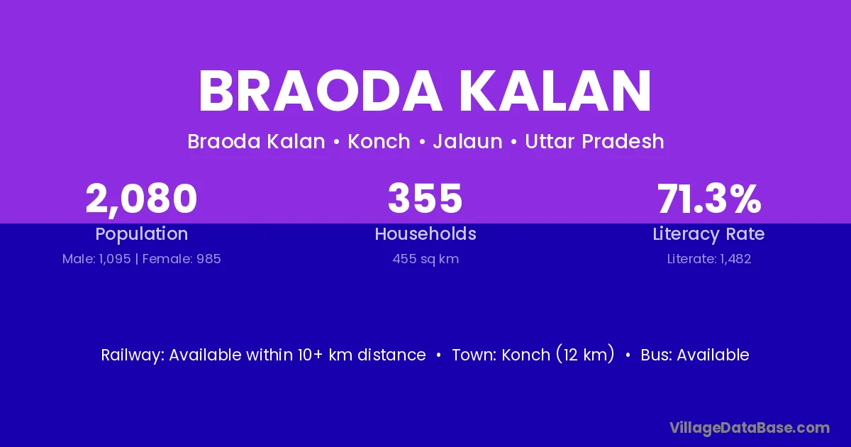 Konch (12 km) is the nearest town to Braoda Kalan village for major economic activities and is located approximately 12 km away.
