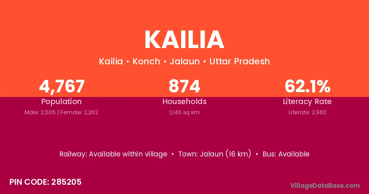 Jalaun (16 km) is the nearest town to Kailia village for major economic activities and is located approximately 16 km away.