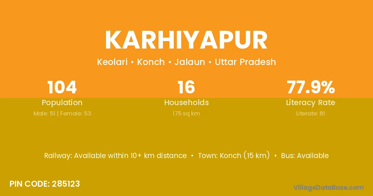 Konch (15 km) is the nearest town to Karhiyapur village for major economic activities and is located approximately 15 km away.