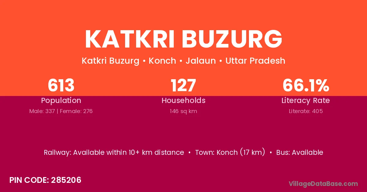 Konch (17 km) is the nearest town to Katkri Buzurg village for major economic activities and is located approximately 17 km away.