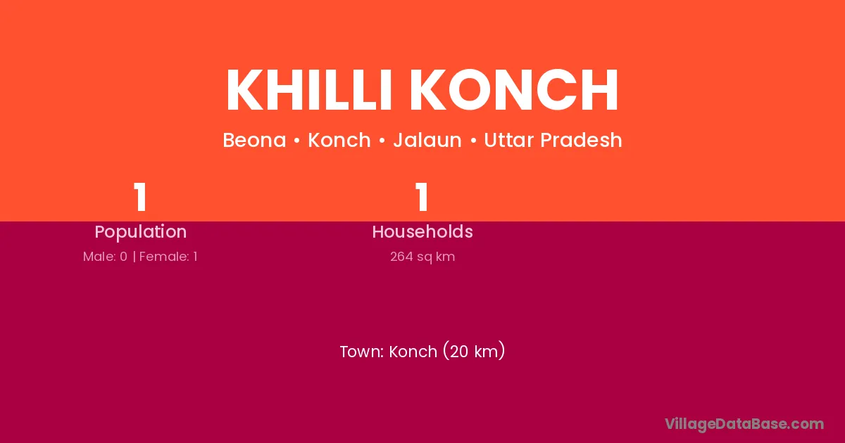 Khilli Konch village has a total population of 1 people, of which 0 are males and 1 are females.