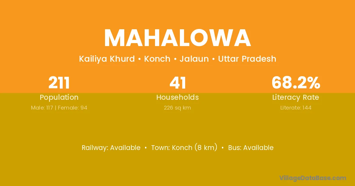 Konch (8 km) is the nearest town to Mahalowa village for major economic activities and is located approximately 8 km away.