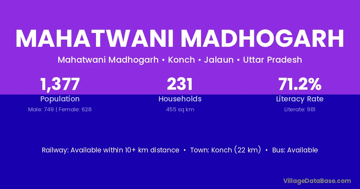 Konch (22 km) is the nearest town to Mahatwani Madhogarh village for major economic activities and is located approximately 22 km away.