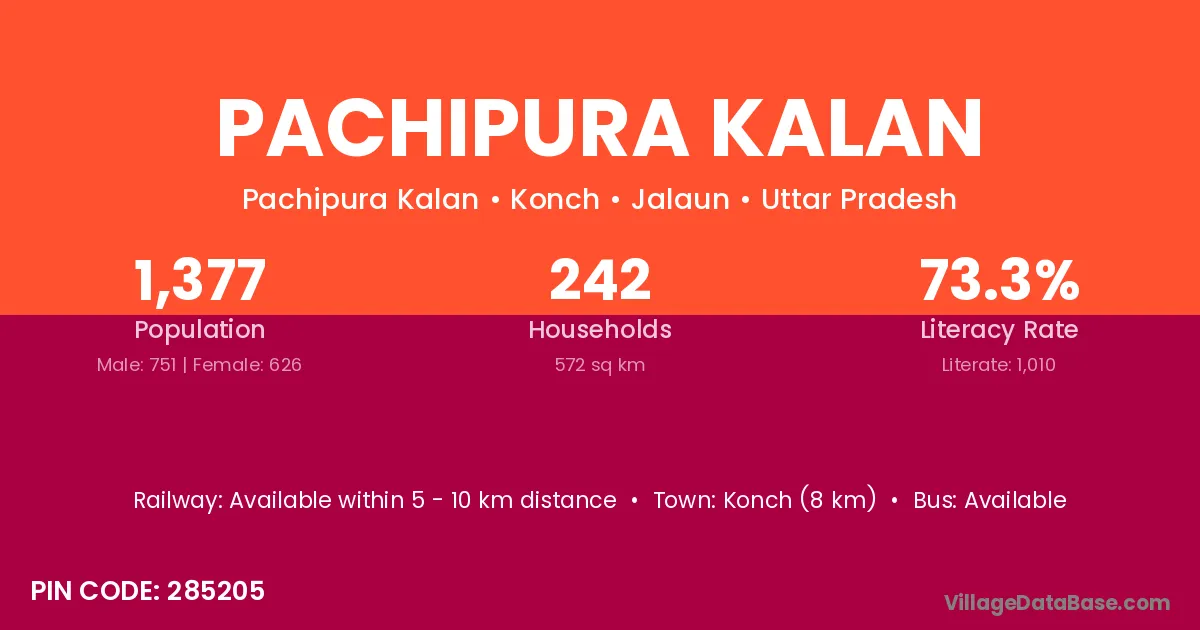 Konch (8 km) is the nearest town to Pachipura Kalan village for major economic activities and is located approximately 8 km away.