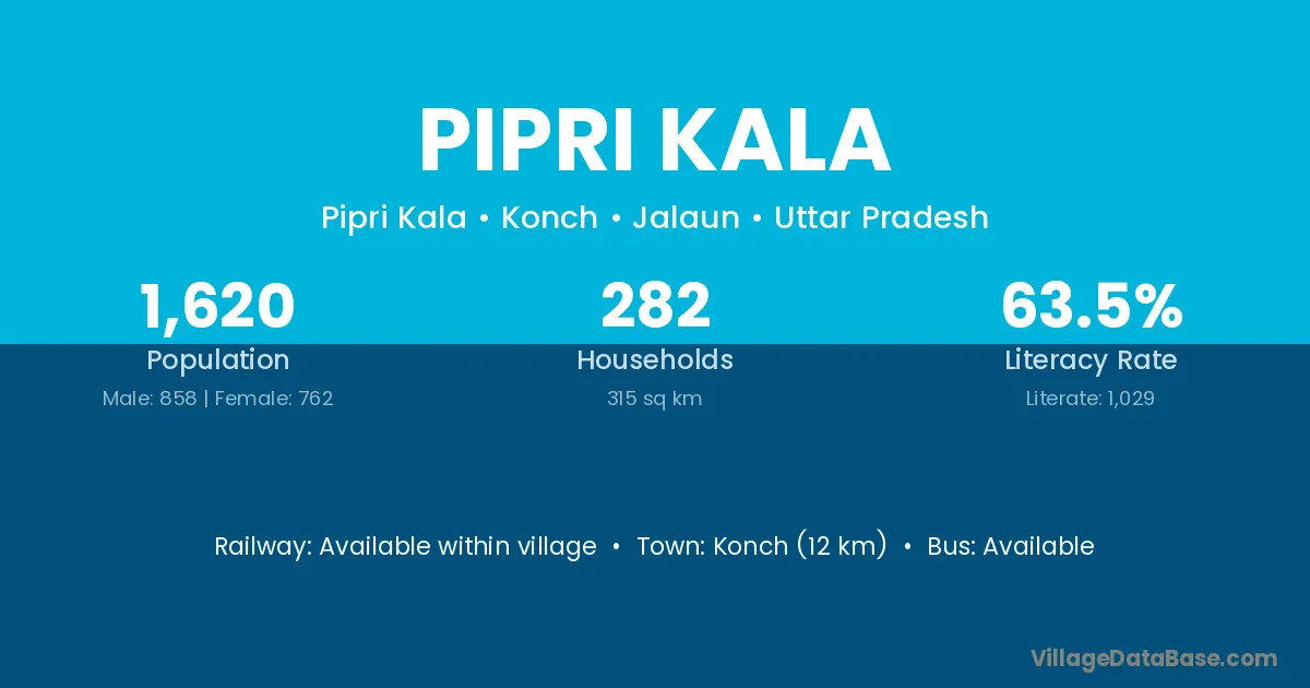 Konch (12 km) is the nearest town to Pipri Kala village for major economic activities and is located approximately 12 km away.