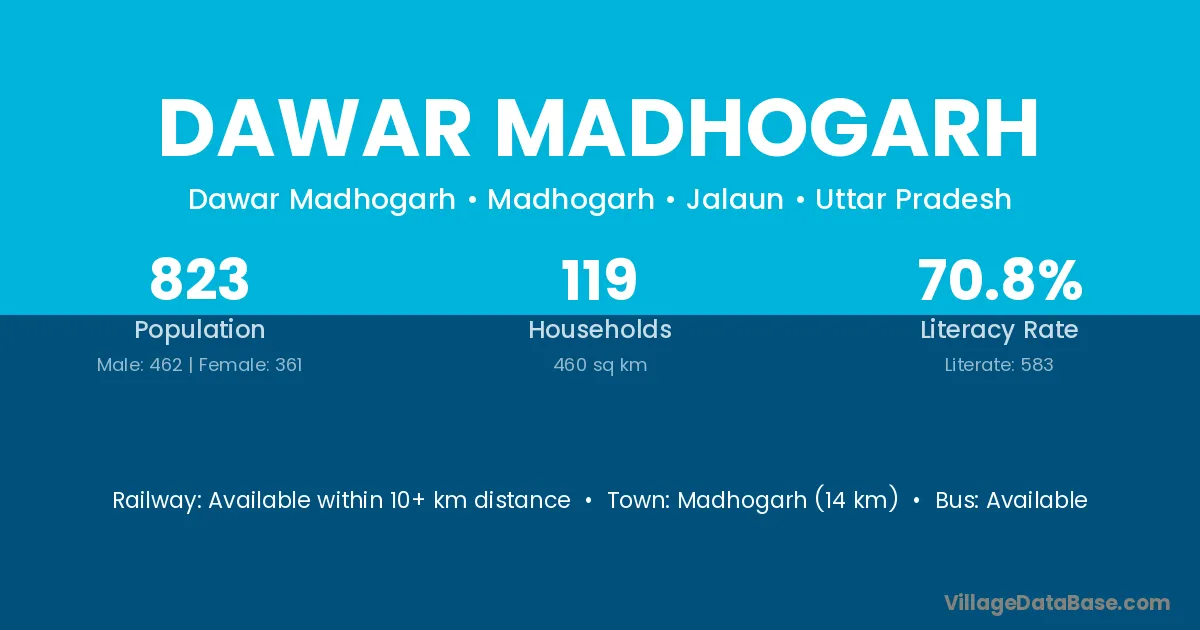 Madhogarh (14 km) is the nearest town to Dawar Madhogarh village for major economic activities and is located approximately 14 km away.