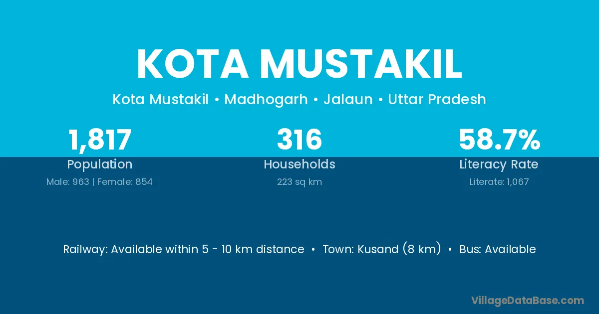 Kusand (8 km) is the nearest town to Kota Mustakil village for major economic activities and is located approximately 8 km away.