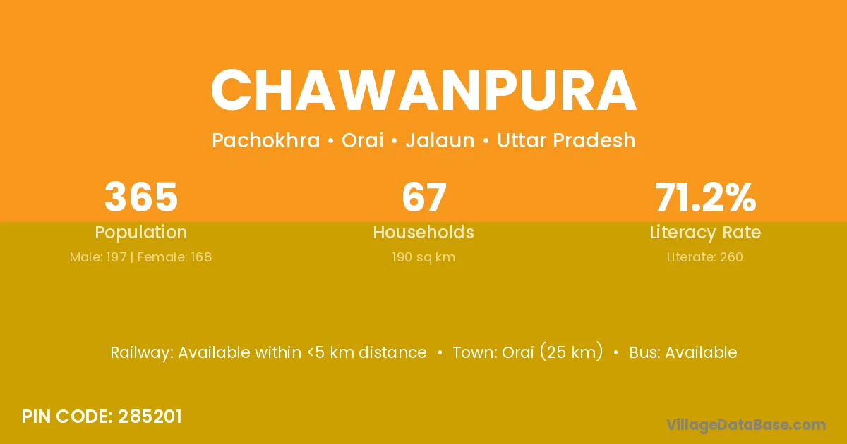 Orai (25 km) is the nearest town to Chawanpura village for major economic activities and is located approximately 25 km away.