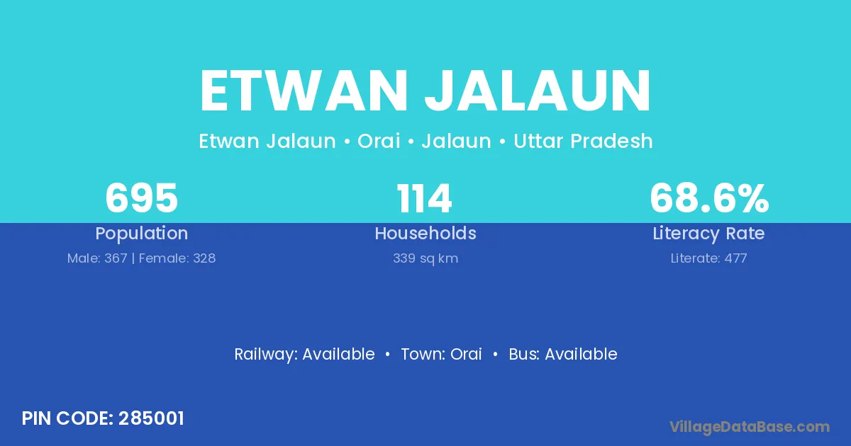 Etwan Jalaun village has a total population of 695 people, of which 367 are males and 328 are females.