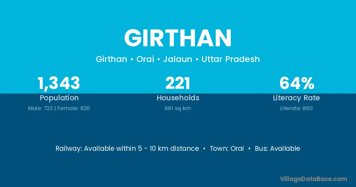 Girthan village has a total population of 1,343 people, of which 723 are males and 620 are females.