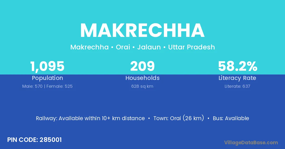 Orai (26 km) is the nearest town to Makrechha village for major economic activities and is located approximately 26 km away.