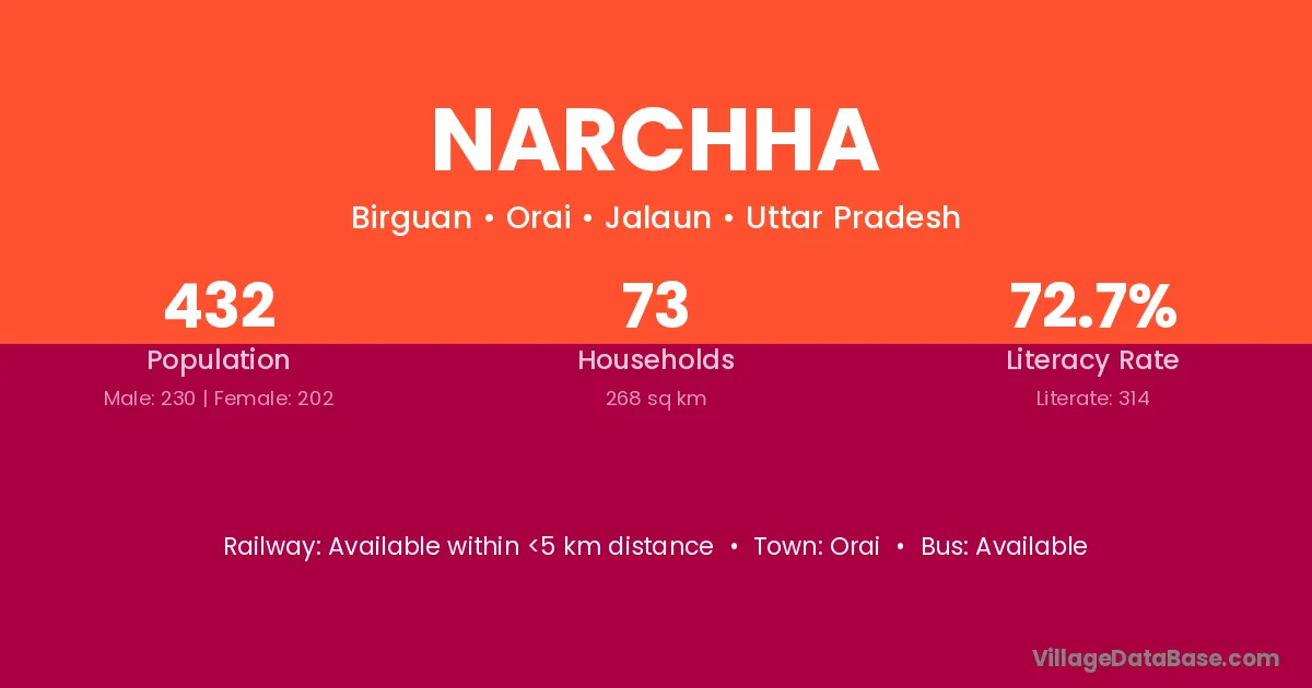 Narchha village has a total population of 432 people, of which 230 are males and 202 are females.