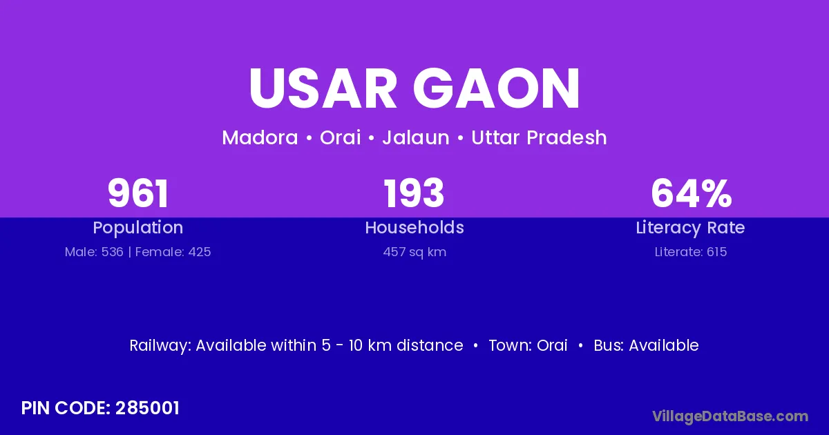 Usar Gaon village has a total population of 961 people, of which 536 are males and 425 are females.