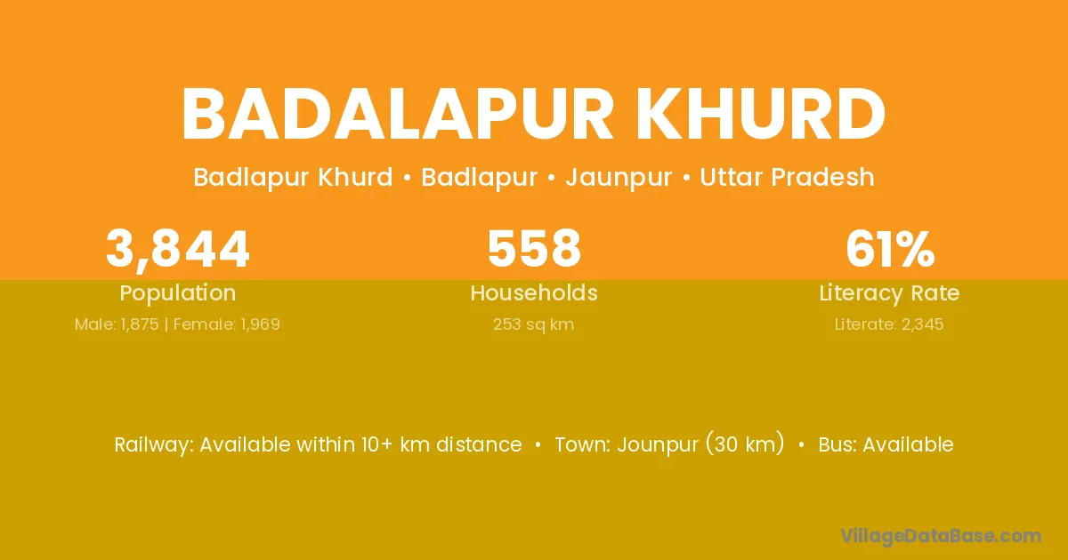 Jounpur (30 km) is the nearest town to Badalapur Khurd village for major economic activities and is located approximately 30 km away.