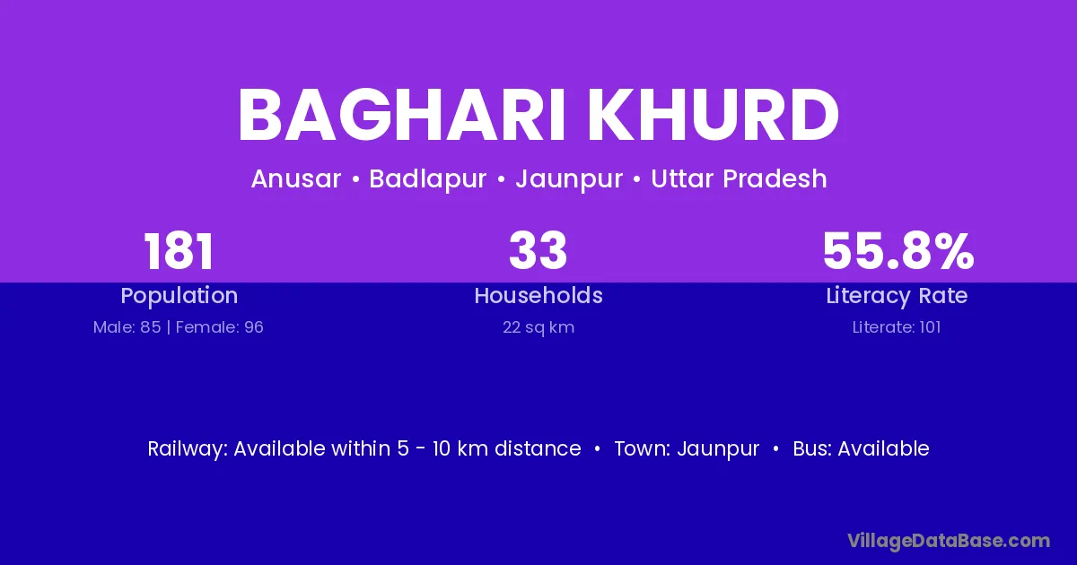 Baghari Khurd village has a total population of 181 people, of which 85 are males and 96 are females.