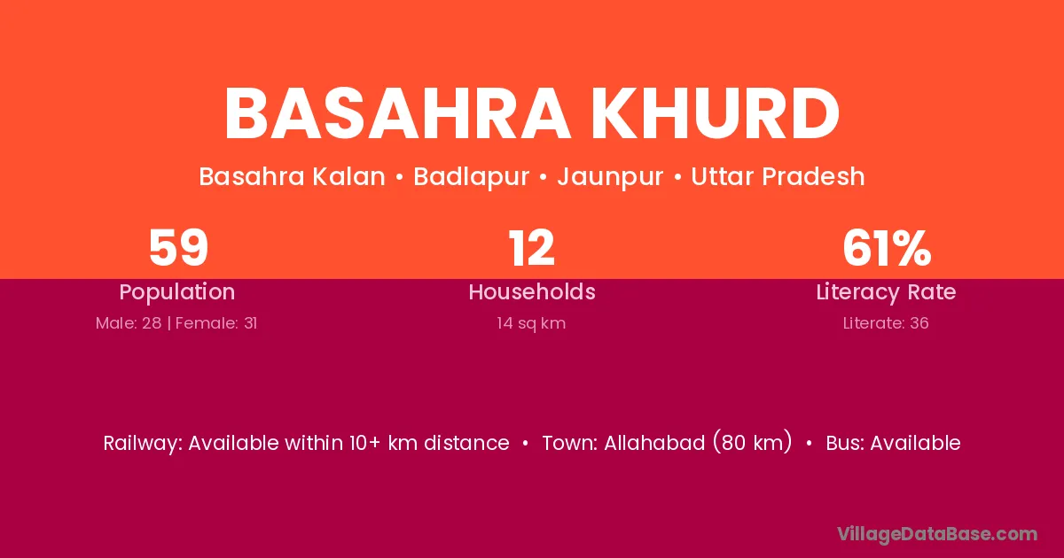 Basahra Khurd village has a total population of 59 people, of which 28 are males and 31 are females.