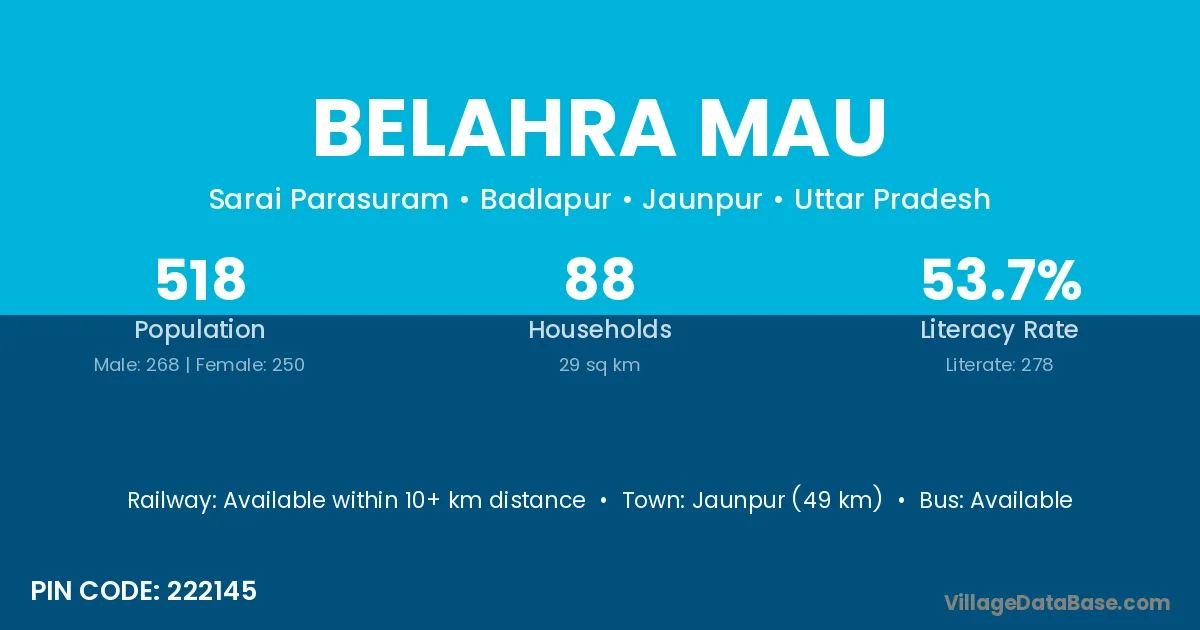Jaunpur (49 km) is the nearest town to Belahra Mau village for major economic activities and is located approximately 49 km away.